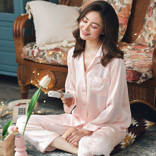 Dames satijnen zomerpyjama • Pyjama-set voor thuis • Nachtkleding met lange mouwen • Nachtpak • Lichtroze ice-silk of wit • Damespyjama